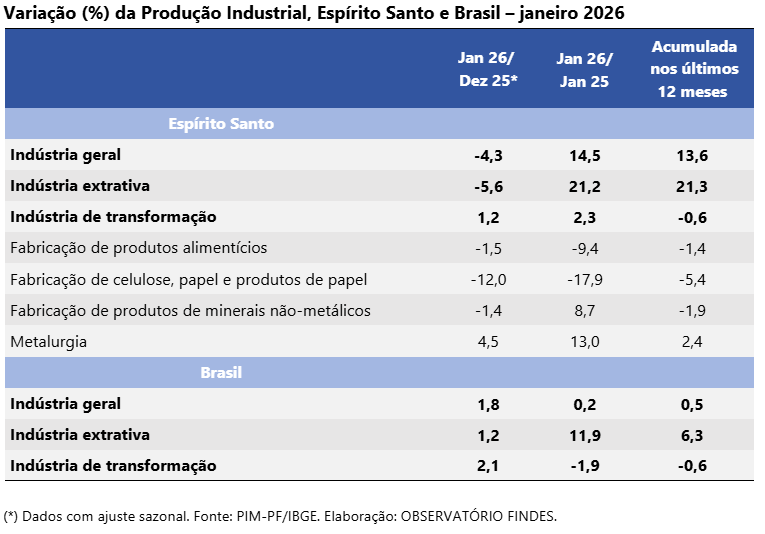 Para o presidente da Federação das Indústrias do Espírito Santo (FINDES), Paulo Baraona, o primeiro resultado da produção industrial do ano mostra que a indústria capixaba mantém o ritmo de crescimento. O Espírito Santo encerrou 2025 na liderança dos estados com a maior produção industrial do país e começa 2026 mantendo essa expansão. Vale destacar o crescimento da indústria extrativa, que tem um papel estratégico nesse desempenho e foi determinante para os bons números do Espírito Santo no ano passado.