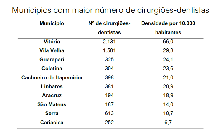 Apesar da alta quantidade de profissionais, a distribuição no território não ocorre de forma homogênea. A maior parte dos dentistas está concentrada em regiões mais urbanizadas e economicamente dinâmicas, especialmente na Região Metropolitana da Grande Vitória, com 5.572 cirurgiões-dentistas. Municípios como Vitória, Vila Velha e Serra concentram grande parcela dos profissionais e da infraestrutura de atendimento odontológico, tanto público quanto privado.