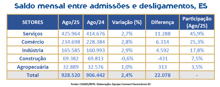 Segundo o coordenador do Observatório do Comércio do Connect Fecomércio-ES, André Spalenza, o desempenho de agosto no estado representa uma recomposição natural do mercado, que vinha de dois meses de ajustes após o pico sazonal da colheita do café. Ele destacou que, mesmo com o recuo da agropecuária, o Espírito Santo manteve o saldo positivo graças à força do setor de serviços e ao dinamismo de segmentos ligados à administração pública, educação e saúde.